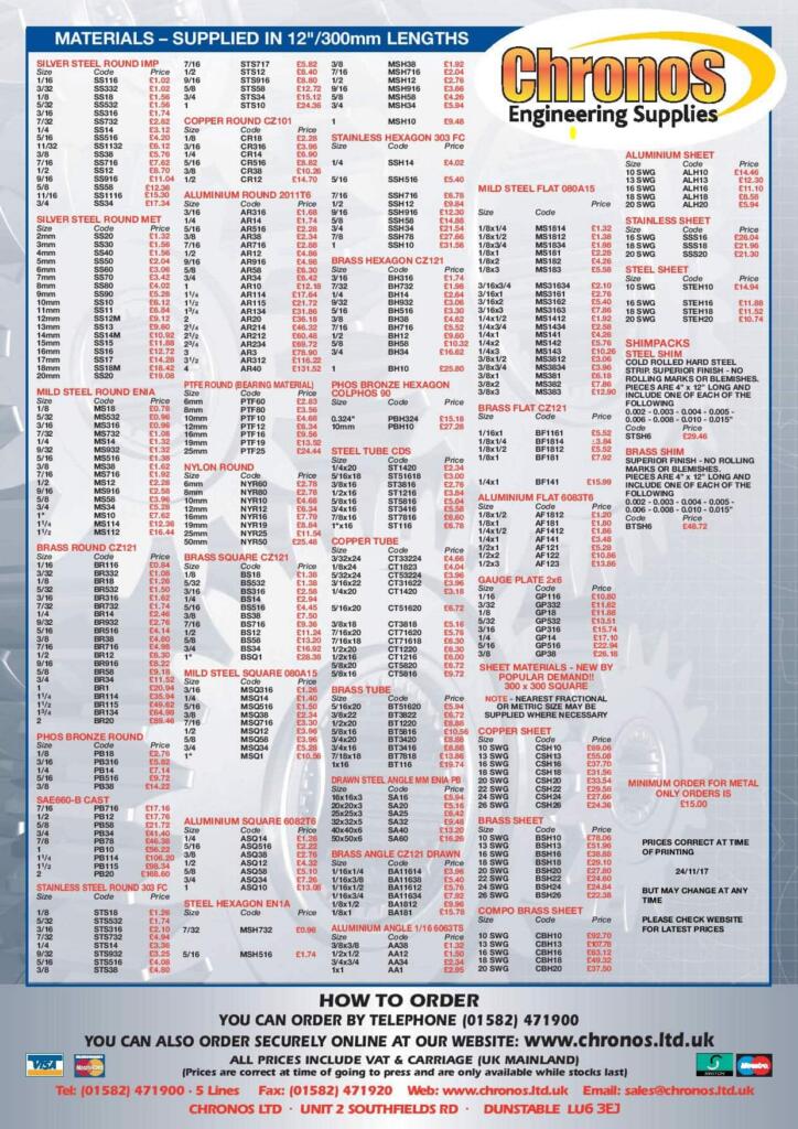 A Comprehensive Range of Ferrous & Non Ferrous Metals in Sheet & 12 ” Lengths plus Nylon , PTFE , Shimstock etc in pdf format.