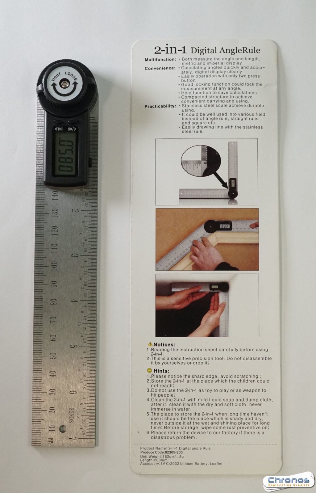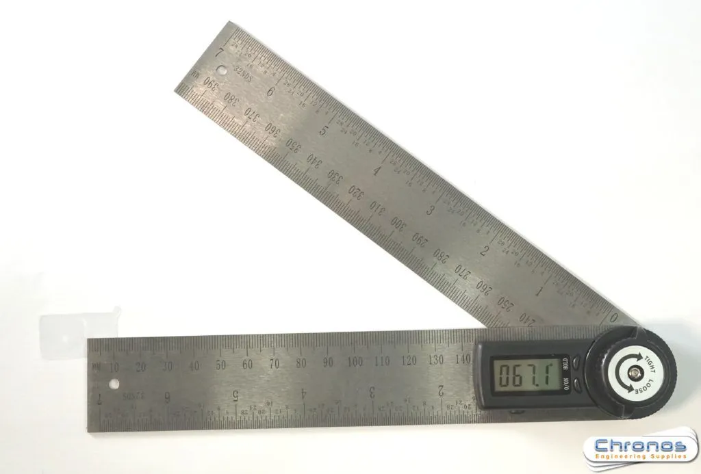 Great for measuring angles quickly and accurately and has a clear digital display. Easy to operate with only two press buttons. It has a hold function as well as a locking knob, to lock in the measurement at any angle. It can also be used as a straight ruler and a square. Compact design -convenient carrying and usability. Stainless steel scale. It can be used in all sorts of fields such as metalwork, toolmaking, carpentry, cabinet making, building industry etc.