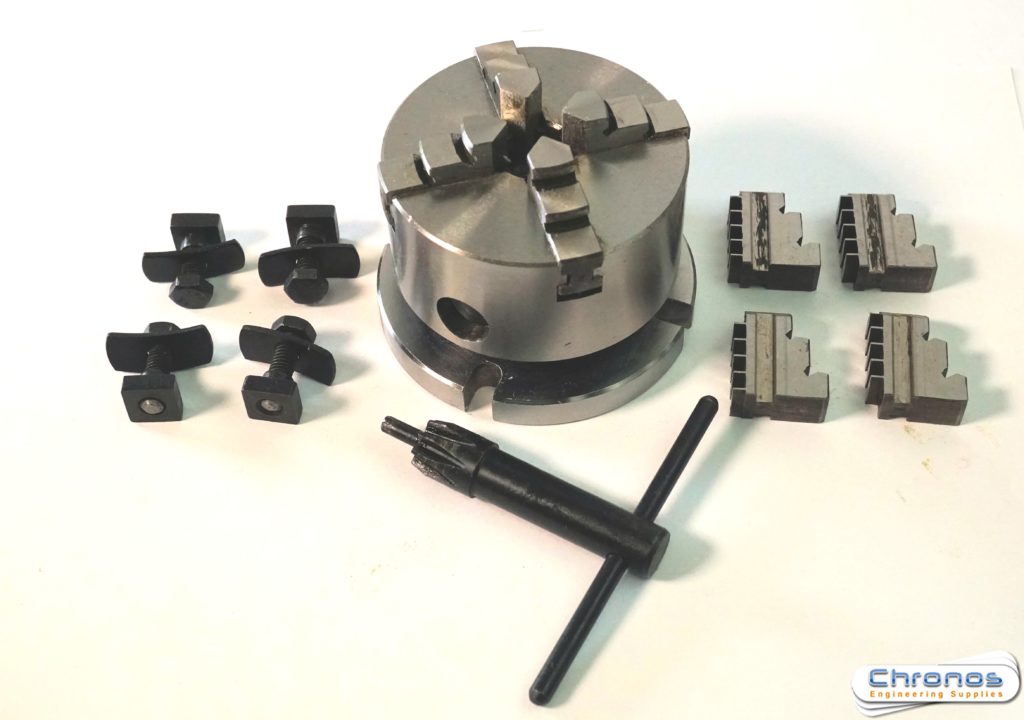 This comprises a good quality 70 mm dia 4 jaw self centering chuck and key mounted on a slotted backplate. This will fit any 3 or 4″ rotary table with 4 slots. The chuck mounting is standard Unimat Thread