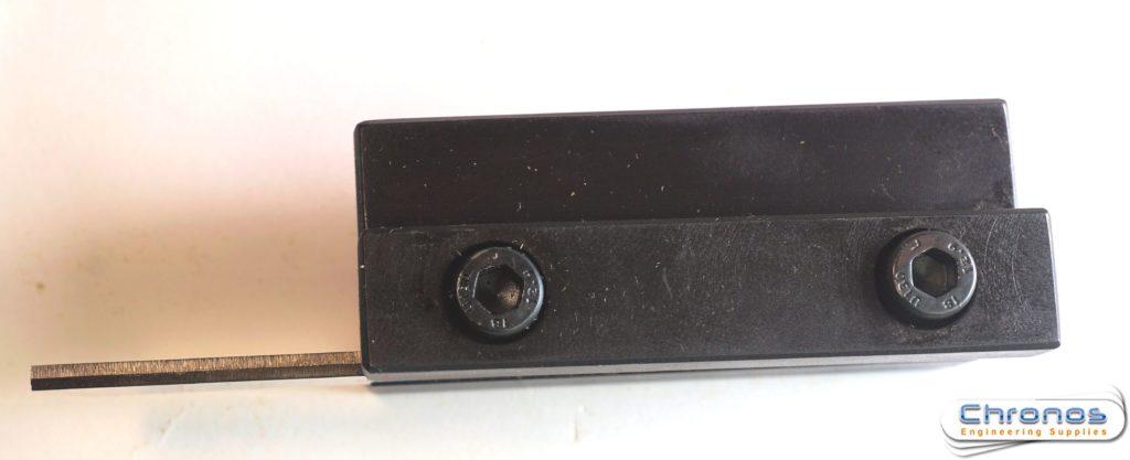 This superb parting tool is a two piece unit of rigid construction for 100% clamping power. It can be used on front or rear toolposts. Complete with 1/2″ HSS blade. Shank size is 3/8″