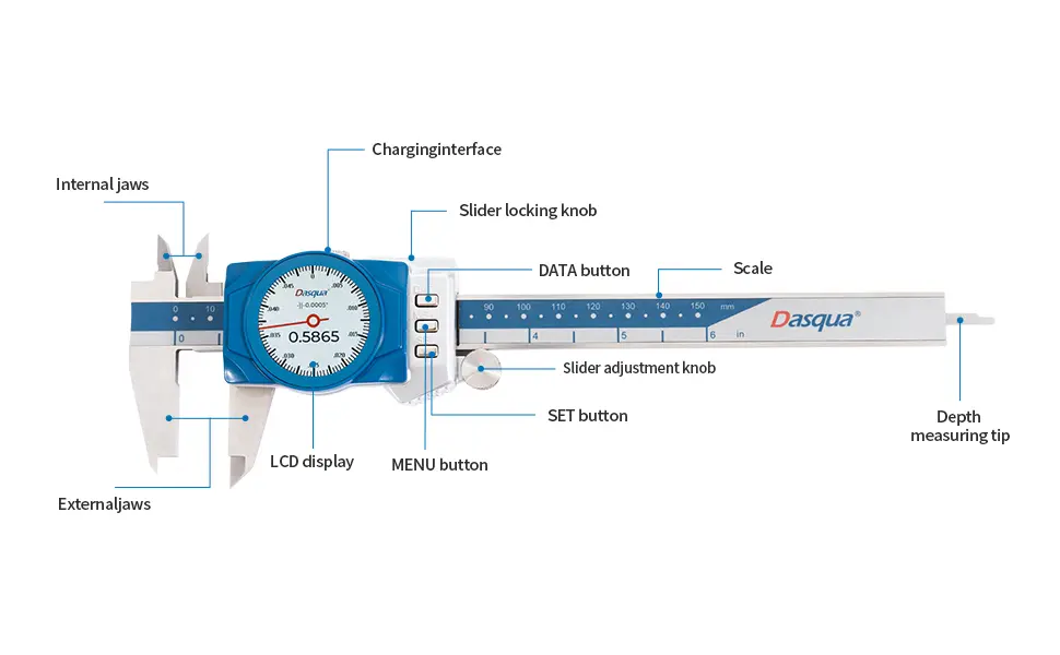 •Precision: Dasqua dial digital caliper measuring tool has a measurement range of 0 – 6”/ 0 – 150 mm; accuracy to ±0.001”/0.02mm and resolution to 0.0005″/0.01mm/1/128″.