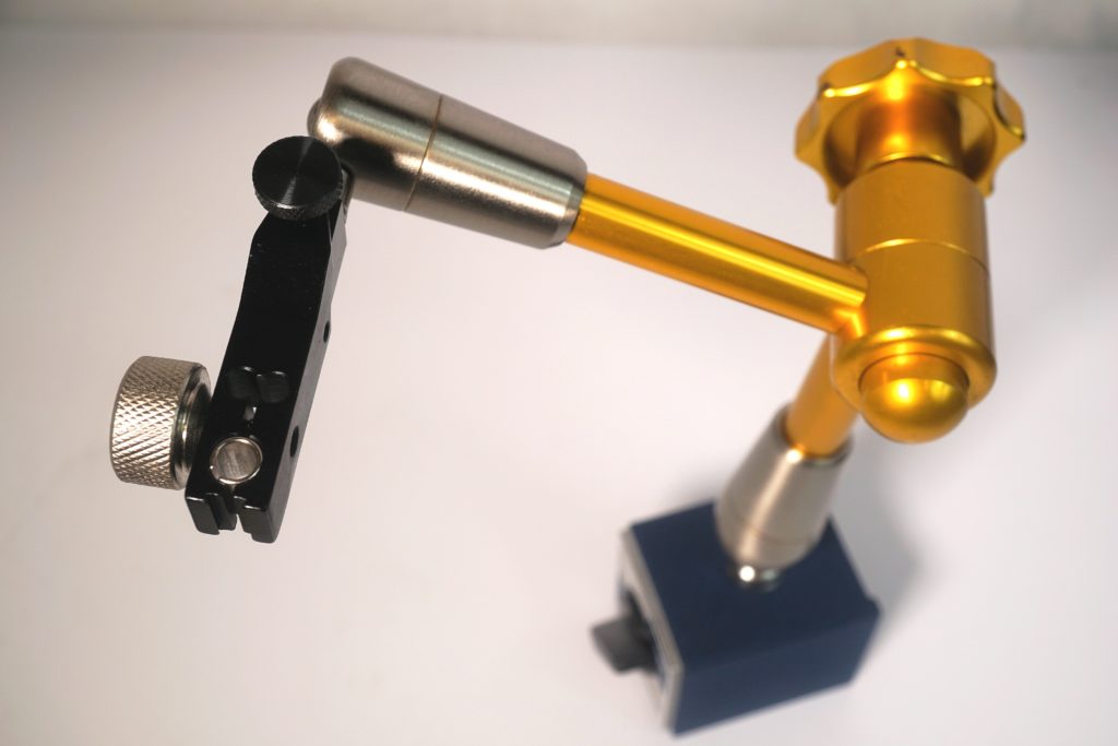 Mechanical central locking of all joints. Special structure ensures high pressure. Oil hydraulics protected against oil leakage by double seals.Powerful permanent magnet. V-grooved base for ease of mount on cylindrical parts also. Joined arms rotate 360° on the dial indicator holder and can be twisted 180°. Smooth and easy on/off switch