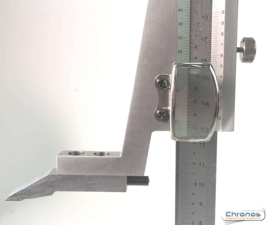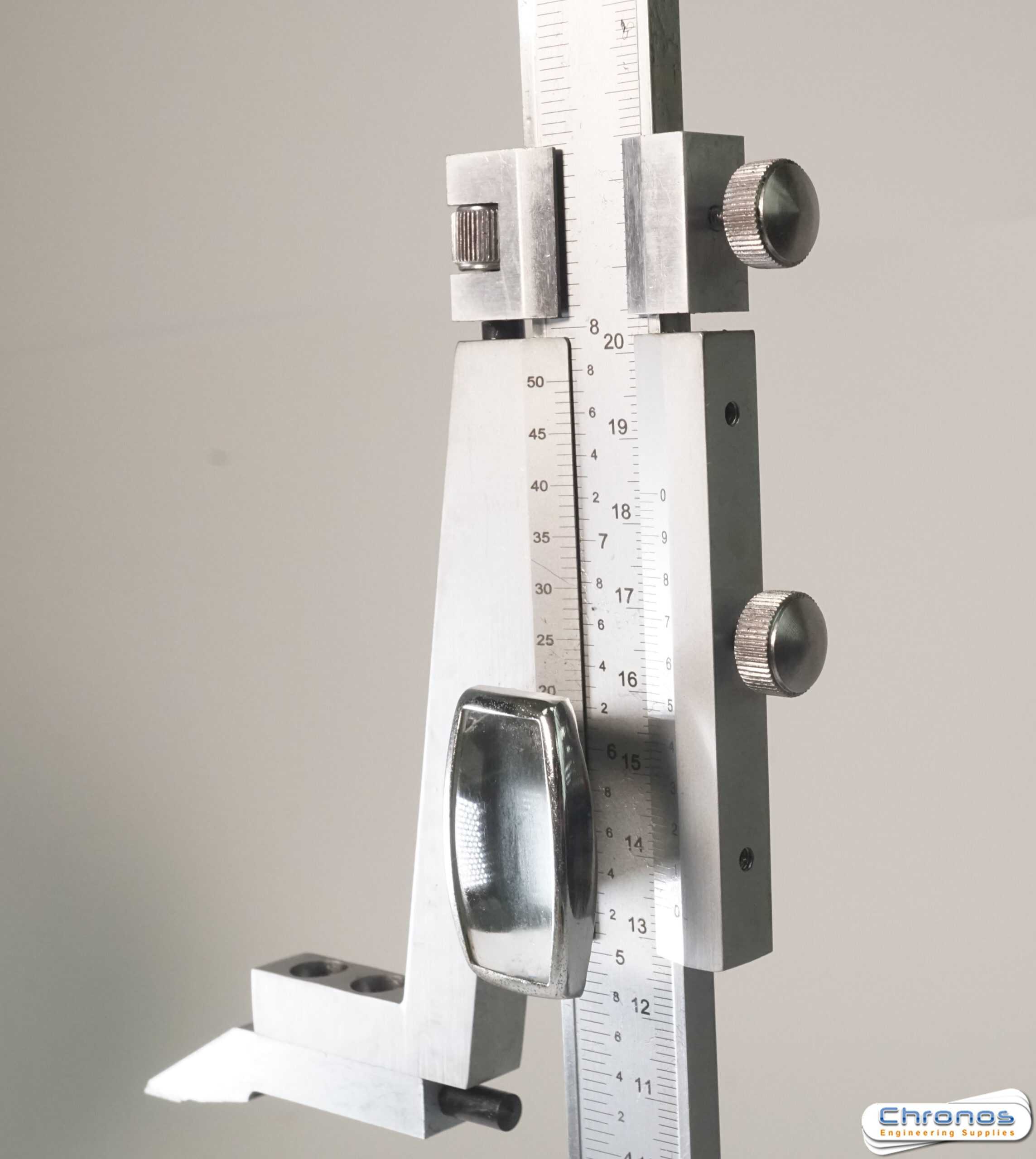 This dual reading 8in/200mm height gauge is equipped with a sliding scale which can be adjusted up or down permitting all measurements to start from even figure references. It is fitted with retractable carbide scriber with facility for fine adjustment. The beam and slide are made of hardened stainless steel. All measuring surfaces are hardened and lapped. Clear black graduations. 200mm/8in Reading 0.02mm/0.001in.