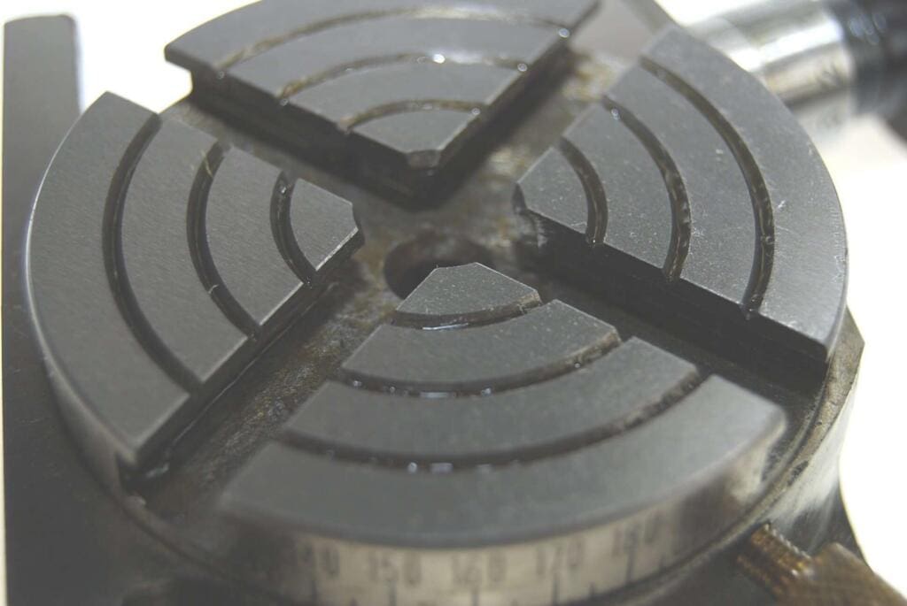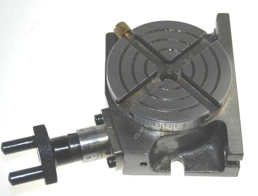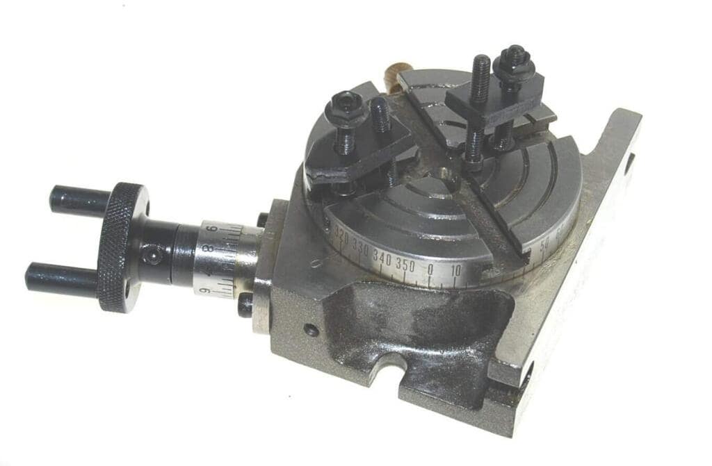 Overall height of table is 1 1/2″ – a useful feature if it is to be used with smaller milling attachments. The table can be locked in any position. Centre height in vertical position 1 1/2 in bringing the table within the range of most model engineering lathes & mills. The hand wheel scale which can be zeroed, is marked in degrees and 10 min divisions. The table is calibrated in 5 deg increments around the rim. Bronze worm wheel and steel worm with 36 to 1 ratio. Gear meshing is adjustable to take up wear.