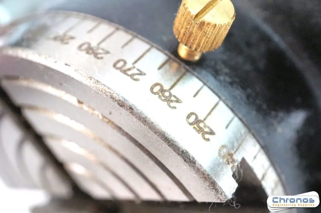 Overall height of table under 2″ – a useful feature if it is to be used with smaller milling attachments. The table can be locked in any position. Centre height in vertical position 2 1/16 in bringing the table within the range of most model engineering lathes & mills. The hand wheel scale which can be zeroed, is marked in degrees and 10 min divisions. The table is calibrated in 5 deg increments around the rim. Bronze worm wheel and steel worm with 36 to 1 ratio. Gear meshing is adjustable to take up wear.