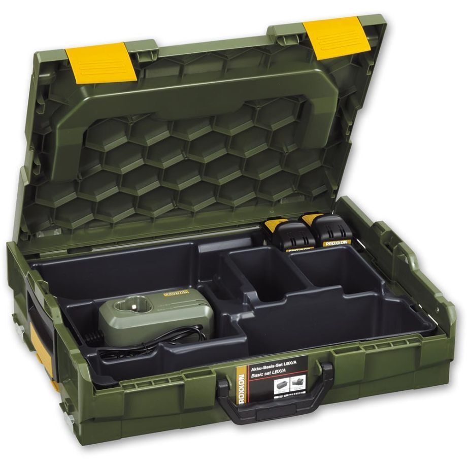 The LBX/A basic set is an economical option for powering, charging and storing Proxxon body only cordless tools. The LBX/A comprises a strong and proven L-BOXX storage case, a rapid charger, two 10.8V (2.6Ah) batteries and a tough moulded insert offering safe storage space for two Proxxon cordless tools along with the charger and batteries. A place for everything and everything in its place.