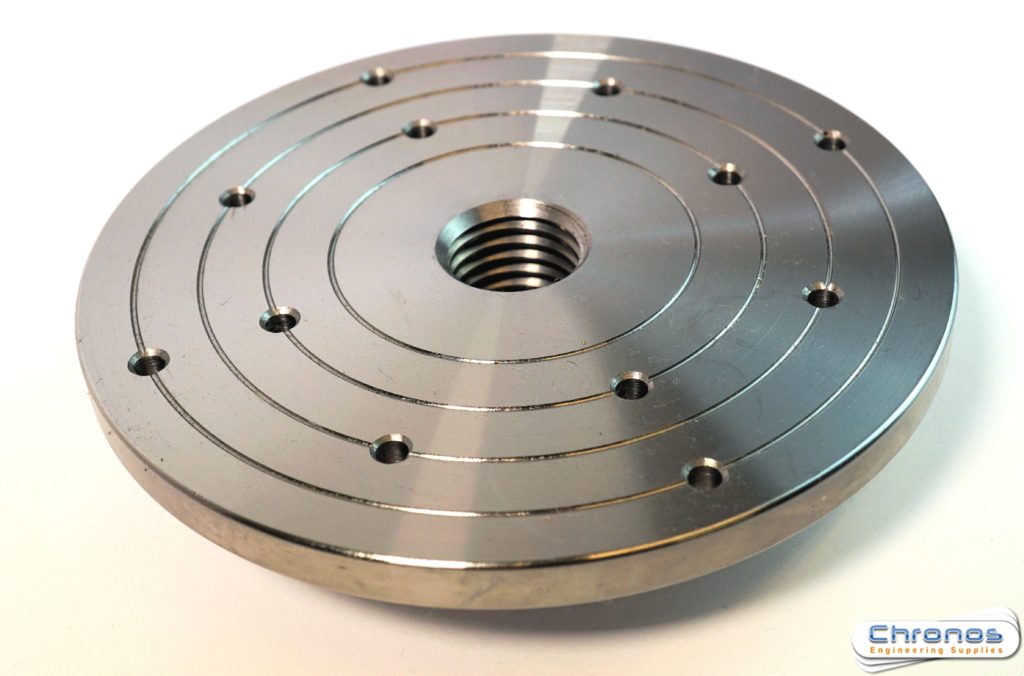 This 150 mm diameter faceplate is CNC-produced for maximum accuracy and perfect balance. The timber mounting holes are countersunk to ensure proper seating of the timber; circular grooves are provided to aid the centering of the blank on the plate.