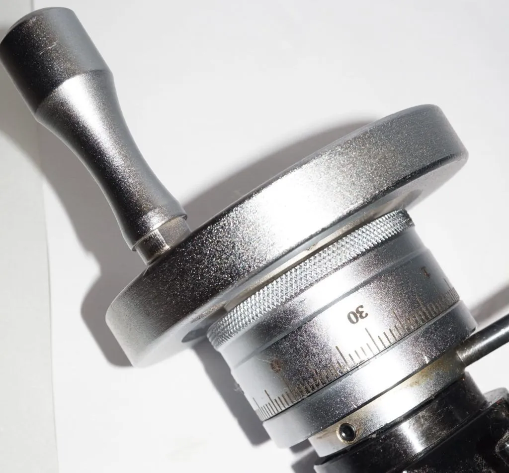 The worm gear ratio is 90:1 i.e. one revolution of the hand wheel = 4′ of rotation of the table and the vernier scale is calibrated to 10 sec.